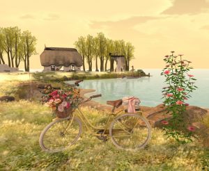 And then I remembered. When I entered, there was a red parrot sitting on a painting. I went back there and wham! A girl landed next to me and started dancing! When she did not stop, I thought probably that was her AO. A couple of other women were now at a distance. One brooding sitting on a swing and another just standing nearby in between the tall grass. In a place as beautiful as this, why was everyone looking so sad? I had my share of cold responses already so I wasn’t one to ask. Or maybe they were having a conversation. In SL, you could never know who was talking to whom and to how many people at the same time. Just as I was wondering about this, another girl landed. All she did was run and jump. I have never seen anyone so happy!