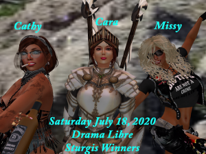You motorcycle, the open road and music is all you will ever need. This week, Drama Libre presented Sturgis second life, modeled after the Motorcycle Rally and Music Festival taking place in Sturgis, South Dakota. Our fabulous hosts with the most were of course, Xerxes Sismondi and Peachy Sassoon valiantly riding their sexy Vespas on the open road. Tunes were hot, hot, hot thanks to our Ironman Zeplin. This weeks stellar winners were Cathy, Cara, and Missy.